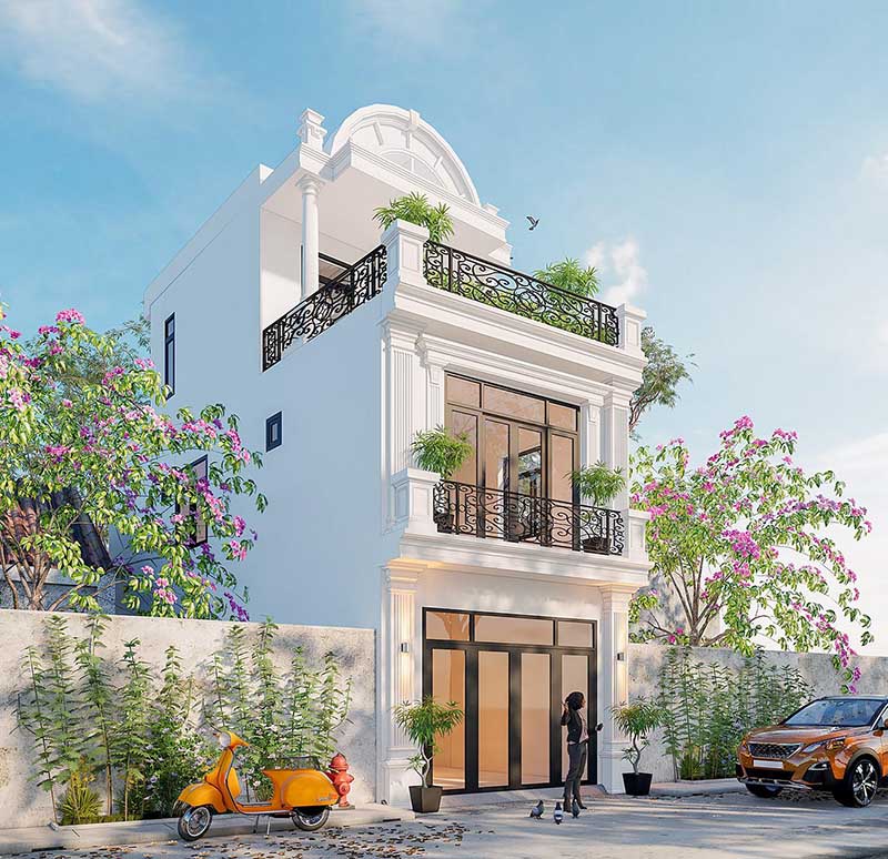 Mẫu nhà phố 1 trệt 1 lầu 1 tum phong cách tân cổ (nguồn: Sưu tầm)