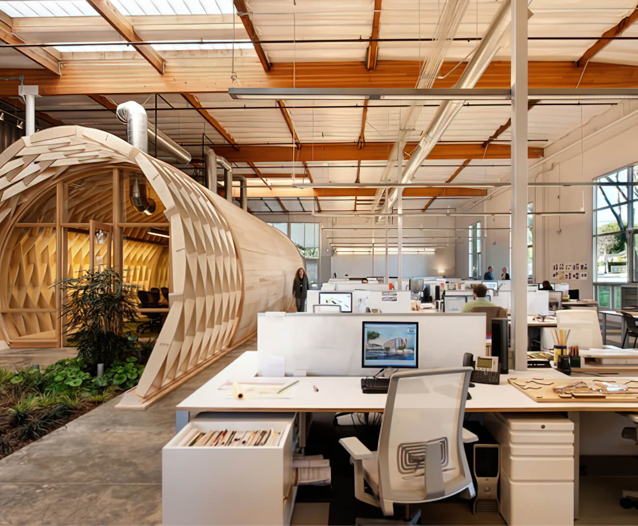 Với trần cao, tường gạch thô, khung thép và ánh sáng nhân tạo, phong cách công nghiệp mang lại vẻ cá tính, mạnh mẽ. Đây là lựa chọn lý tưởng cho các văn phòng sáng tạo, studio hoặc không gian làm việc nhóm.