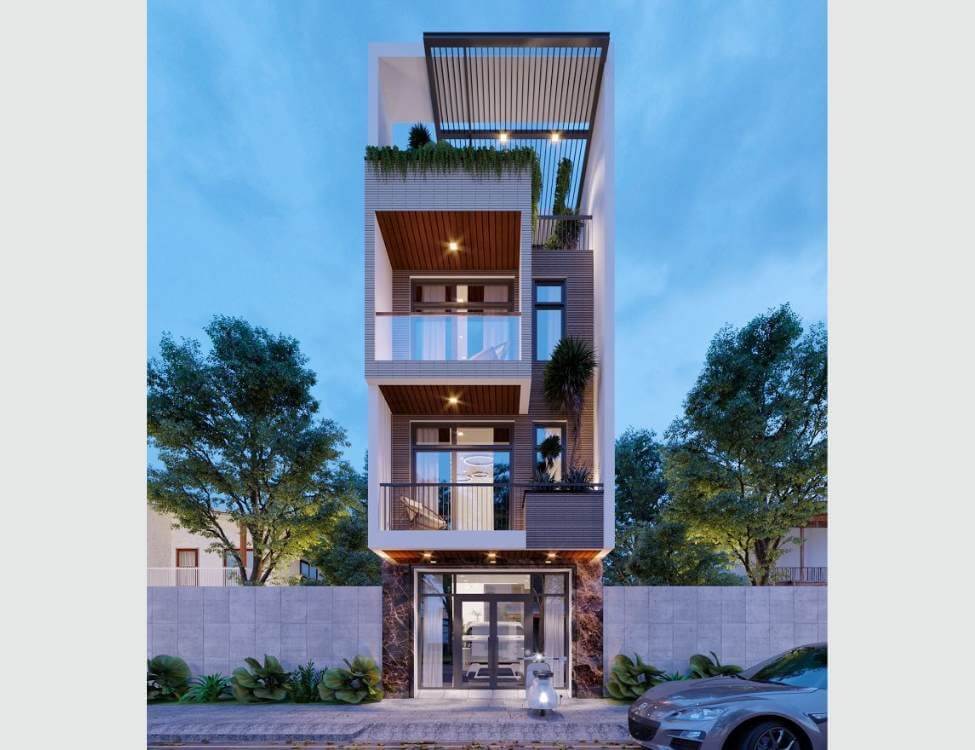 Mẫu nhà này được ưa chuộng bởi sự tiện lợi và sang trọng. Ngoài không gian sinh hoạt, tầng trệt bố trí gara ô tô, tầng thượng có thể làm sân vườn hoặc khu BBQ nhỏ. Kiểu thiết kế này giúp tối ưu diện tích đất và tạo không gian xanh giữa khu phố sầm uất.