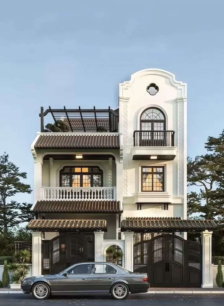 Tân cổ điển mang lại vẻ đẹp sang trọng, tinh tế nhờ sự kết hợp hài hòa giữa cổ điển và hiện đại. Những đường phào chỉ mềm mại, cột trụ vững chắc kết hợp cùng gam màu trắng, kem hoặc vàng nhạt tạo nên một tổng thể quý phái. Với thiết kế nhà phố tại Dĩ An Bình Dương, phong cách này thường được những gia chủ yêu sự bề thế lựa chọn.