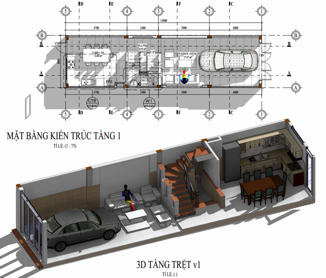 Tầng 1 : 1 để xe hơi , 1 khách , 1 cầu thang + wc , bếp
