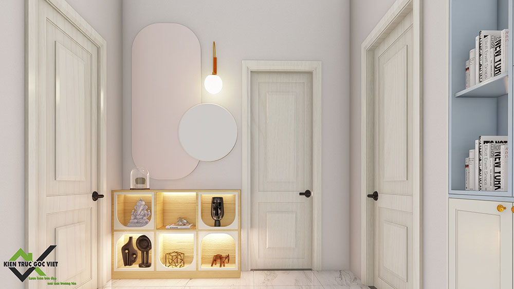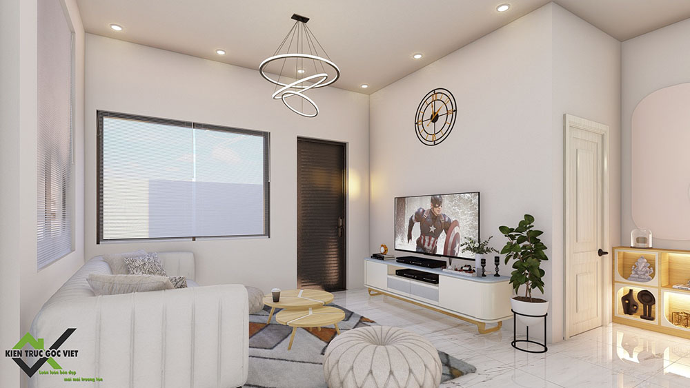 Với phong cách hiện đại , lấy gam màu trắng làm chủ đạo kết hợp với các màng nhấn mang lại cho ngôi nhà cấp 4 thêm cách điệu và đẹp mắt .