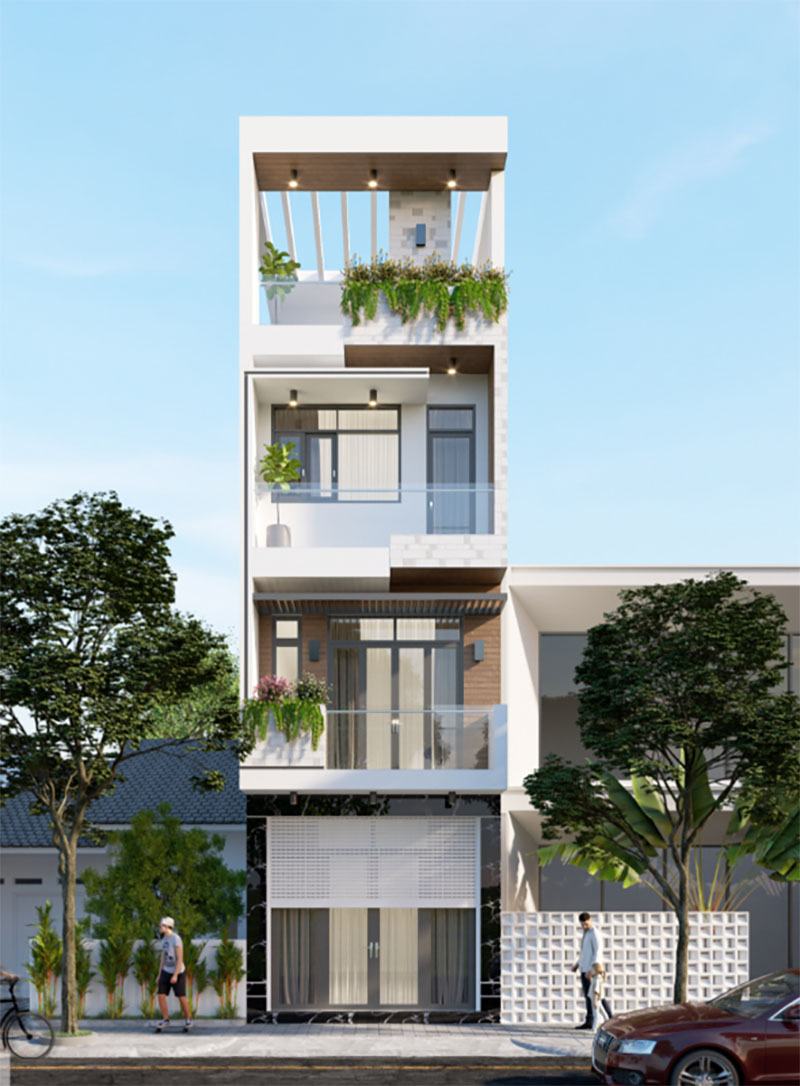 Khả năng phân chia công năng hợp lý là một ưu điểm của mẫu nhà phố này. Tầng trệt thường có phòng khách, bếp và khu vực sinh hoạt chung, trong khi lầu một đến hai thường có phòng ngủ, phòng làm việc hoặc phòng sinh hoạt riêng. Sân thượng là điểm nhấn, vì nó có thể được sử dụng để thiết kế vườn mini hoặc khu BBQ, đồng thời là một nơi thư giãn gần gũi với thiên nhiên. Để tạo cảm giác rộng rãi và thoải mái, thiết kế mở kết hợp cửa kính và giếng trời.