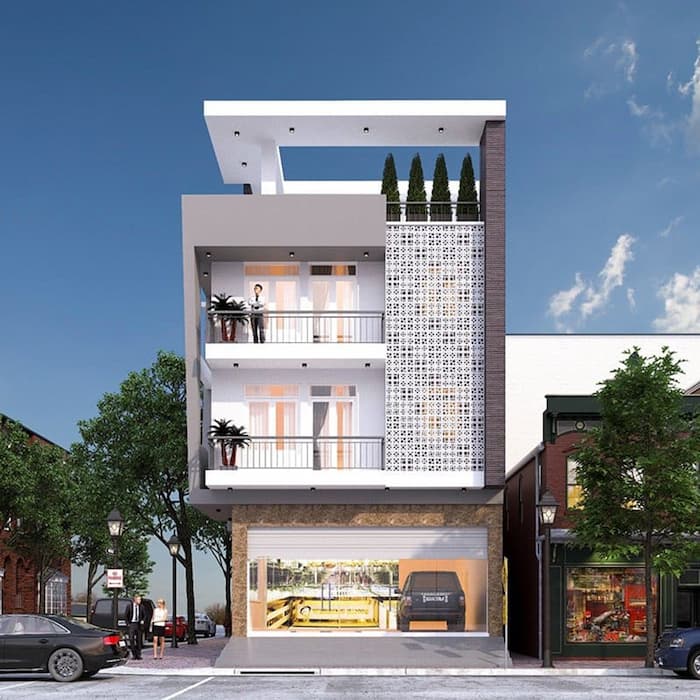 Thiết kế này sẽ dành cho gia đình có nhiều thành viên hoặc muốn tích hợp gara ngay tầng trệt. Bản thiết kế thường gồm tầng 1 là gara - bếp - phòng ăn, tầng 2 là phòng khách và phòng ngủ, tầng 3 là phòng ngủ và phòng thờ. Phối cảnh mặt tiền có thể dùng lam chắn nắng, cửa kính cường lực hoặc bồn cây tạo không gian xanh.