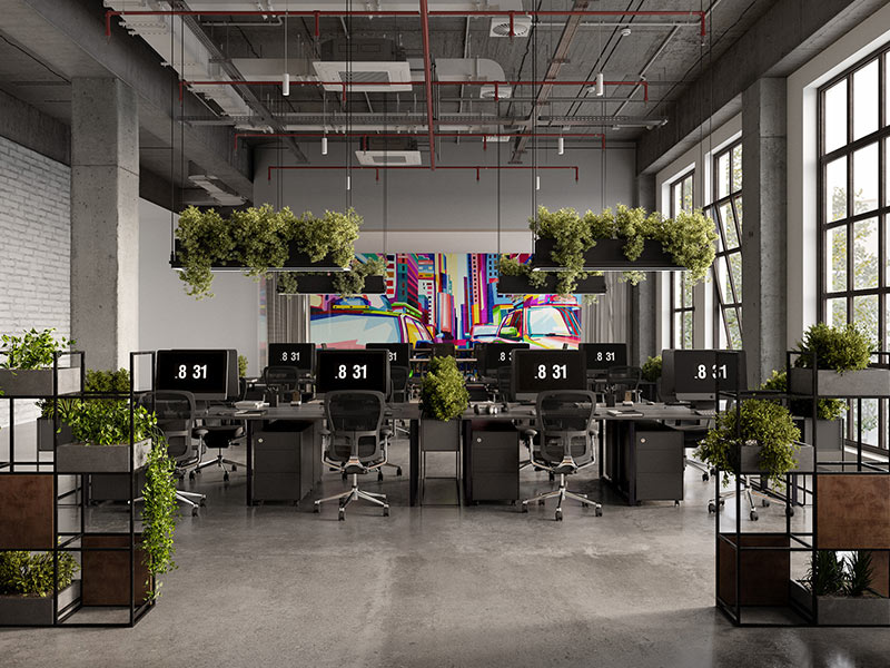Với trần cao, tường gạch thô, khung thép và ánh sáng nhân tạo, phong cách công nghiệp mang lại vẻ cá tính, mạnh mẽ. Đây là lựa chọn lý tưởng cho các văn phòng sáng tạo, studio hoặc không gian làm việc nhóm.