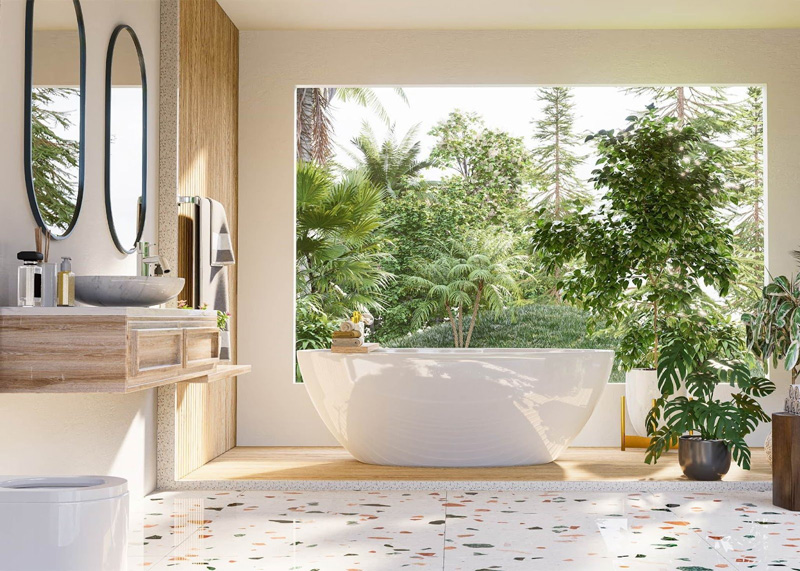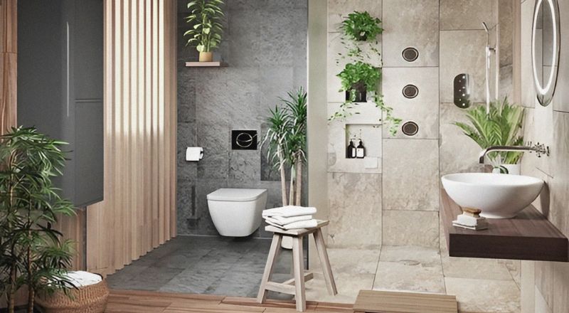 Khi chú trọng đến sự thoải mái và sức khỏe, thiết kế xanh đang là xu hướng được ưa chuộng. Kết hợp cây xanh nhỏ để thanh lọc không khí, cửa sổ lớn hoặc giếng trời tận dụng ánh sáng tự nhiên. Điều này làm cho không gian thoáng mát và gần gũi với thiên nhiên. Nhà vệ sinh của bạn có thể trở thành một "khu spa" nhỏ tại nhà và tiết kiệm năng lượng.